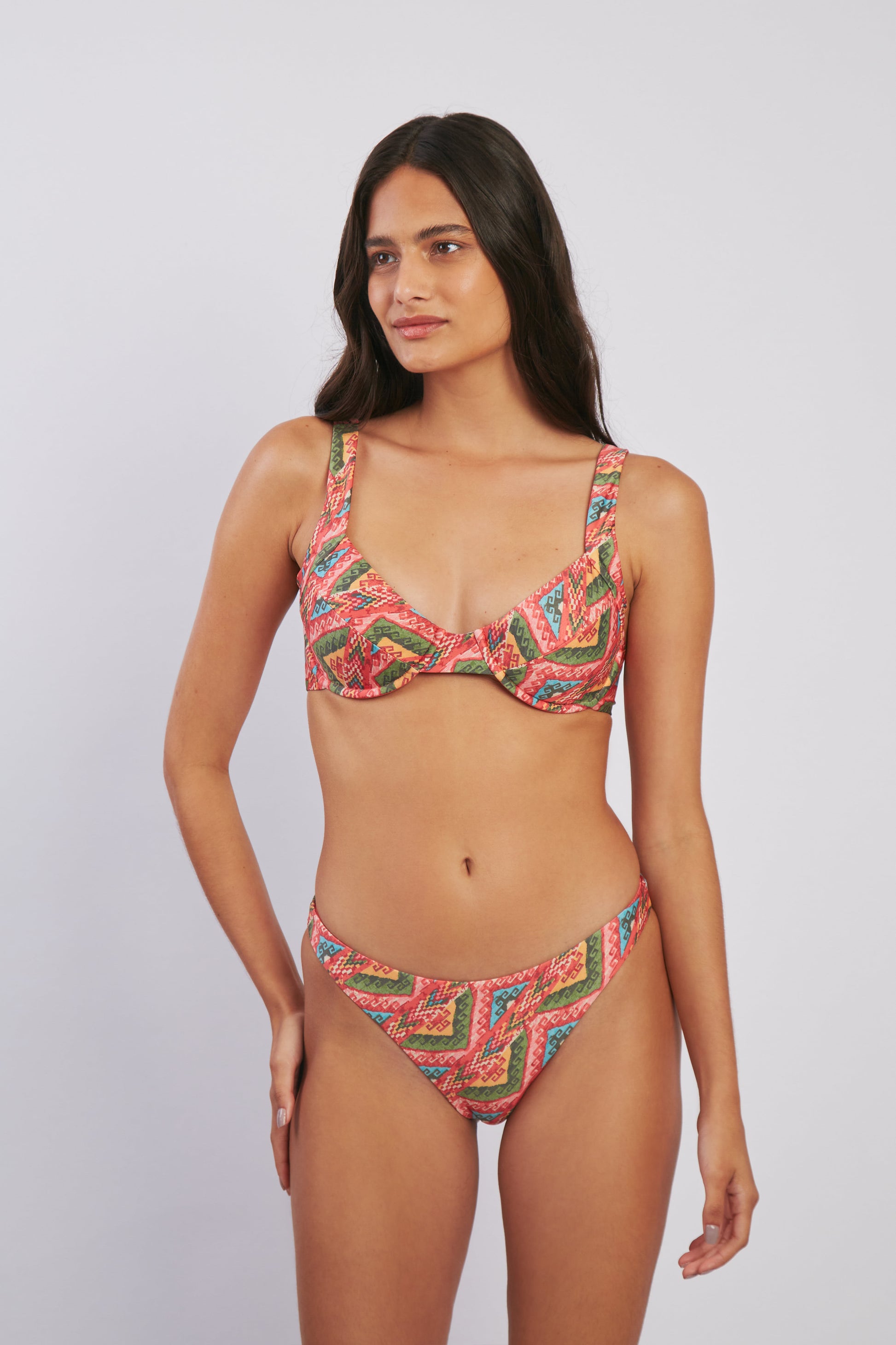Nuestro estampado Andi busca rendir homenaje a los colores y textiles pre-colombinos del Perú. Hecho de fibras recicladas y luciendo una variedad de colores, este bikini es el complemento perfecto a tu bronceado. Diseñado y hecho con amor por mujeres para mujeres.