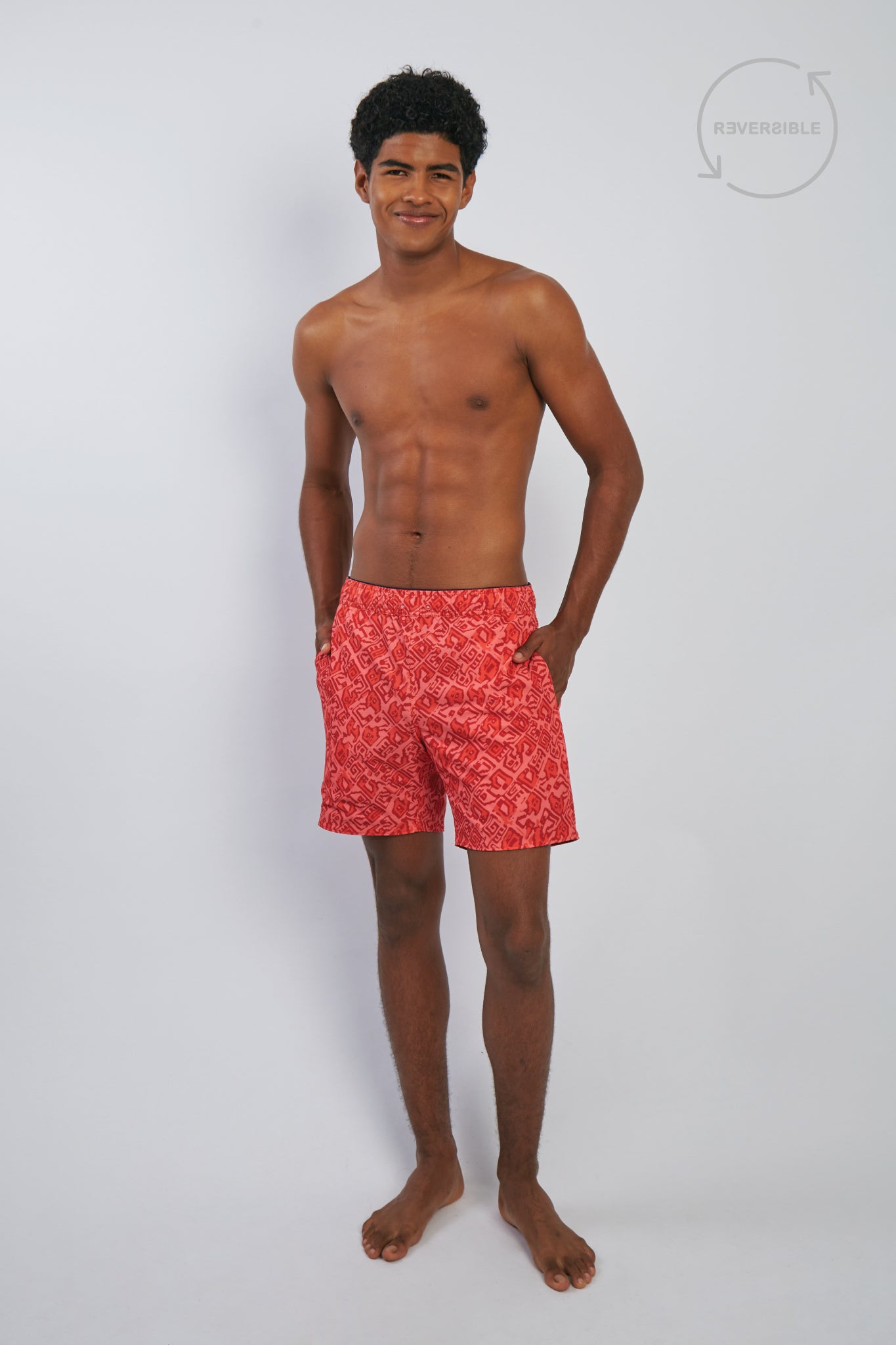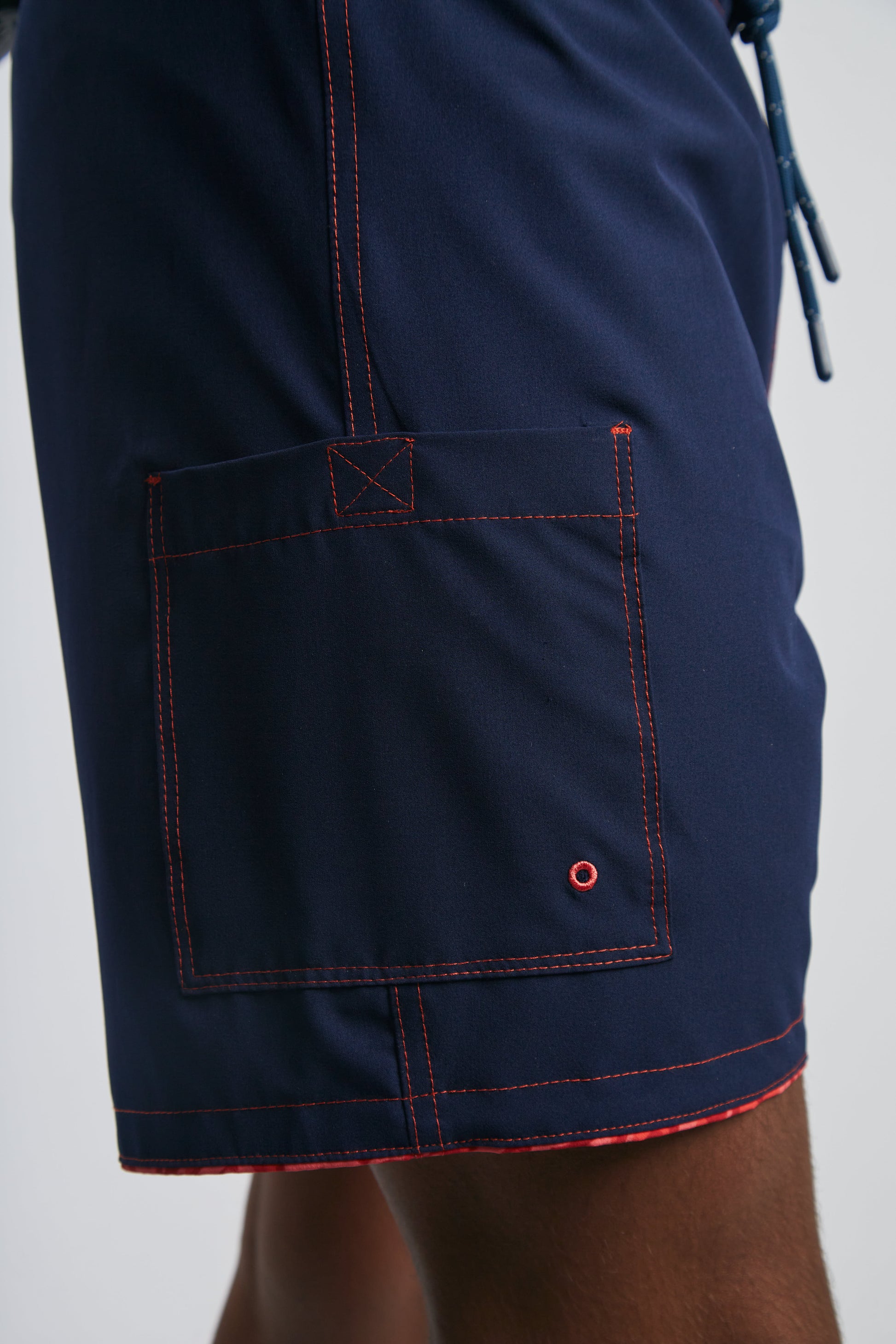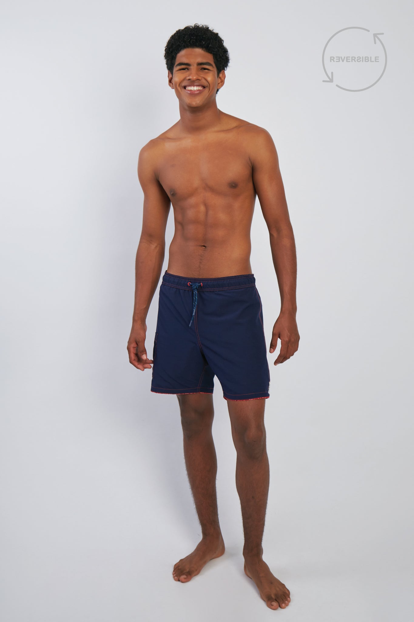 Inspirado en textiles precolombinos Peruanos, nuestro short Misti tiene un lado estampado y brillante coral con bolsillos laterales. Si buscas un look más clásico puedes voltearlo para encontrar un short azul marino con puntadas coral y un bolsillo parche en la pierna. No te preocupes de los revolcones en el mar, el elástico y pasador te mantendrán cómodo sin importar el lado qué lado elijas.