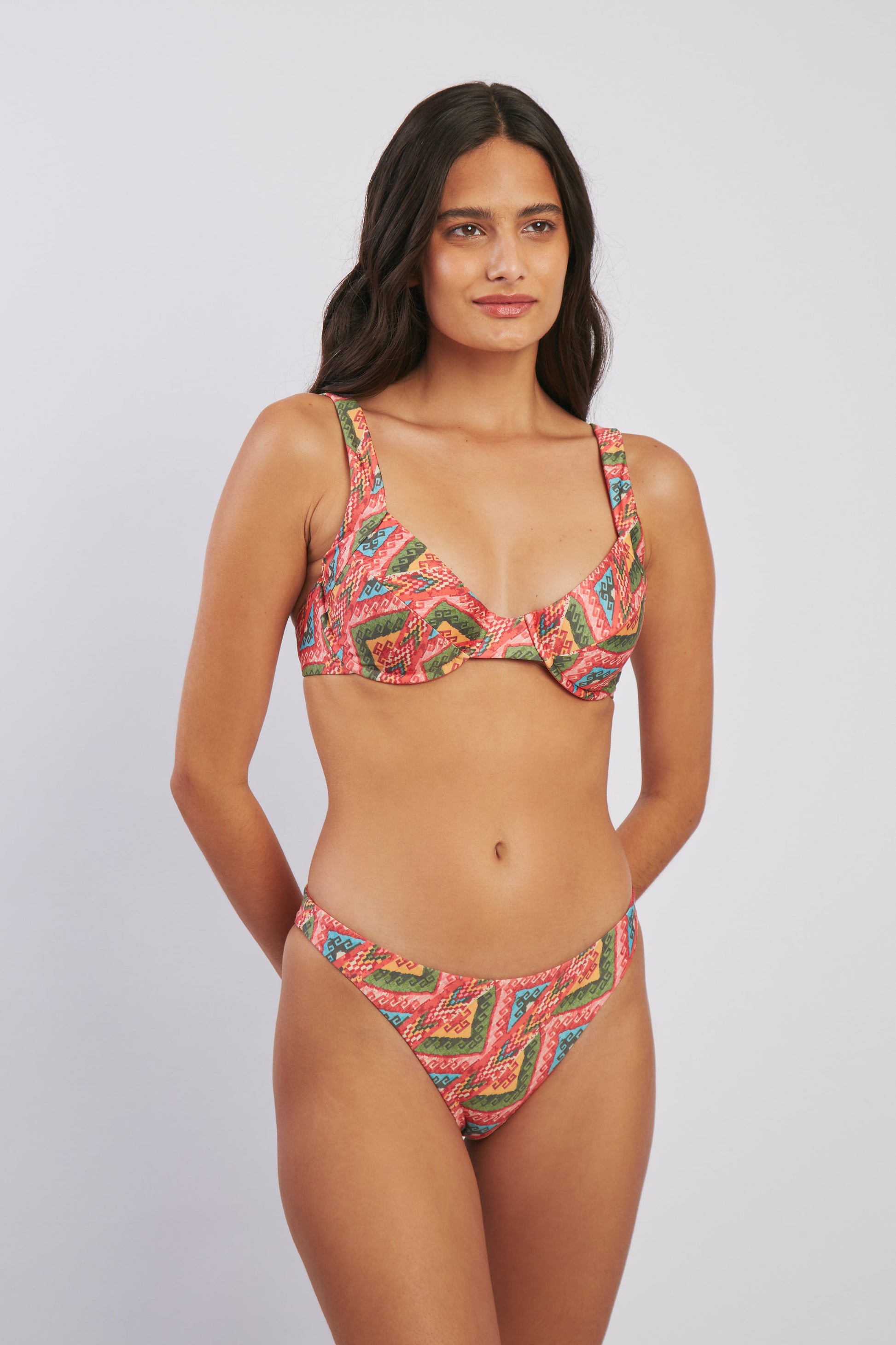 Nuestro estampado Andi busca rendir homenaje a los colores y textiles pre-colombinos del Perú. Hecho de fibras recicladas y luciendo una variedad de colores, este bikini es el complemento perfecto a tu bronceado. Diseñado y hecho con amor por mujeres para mujeres.