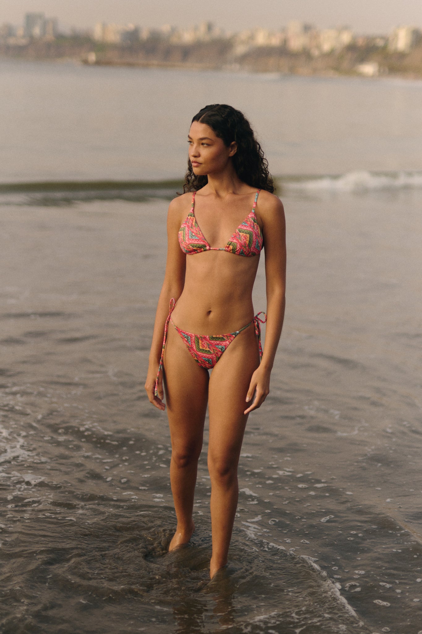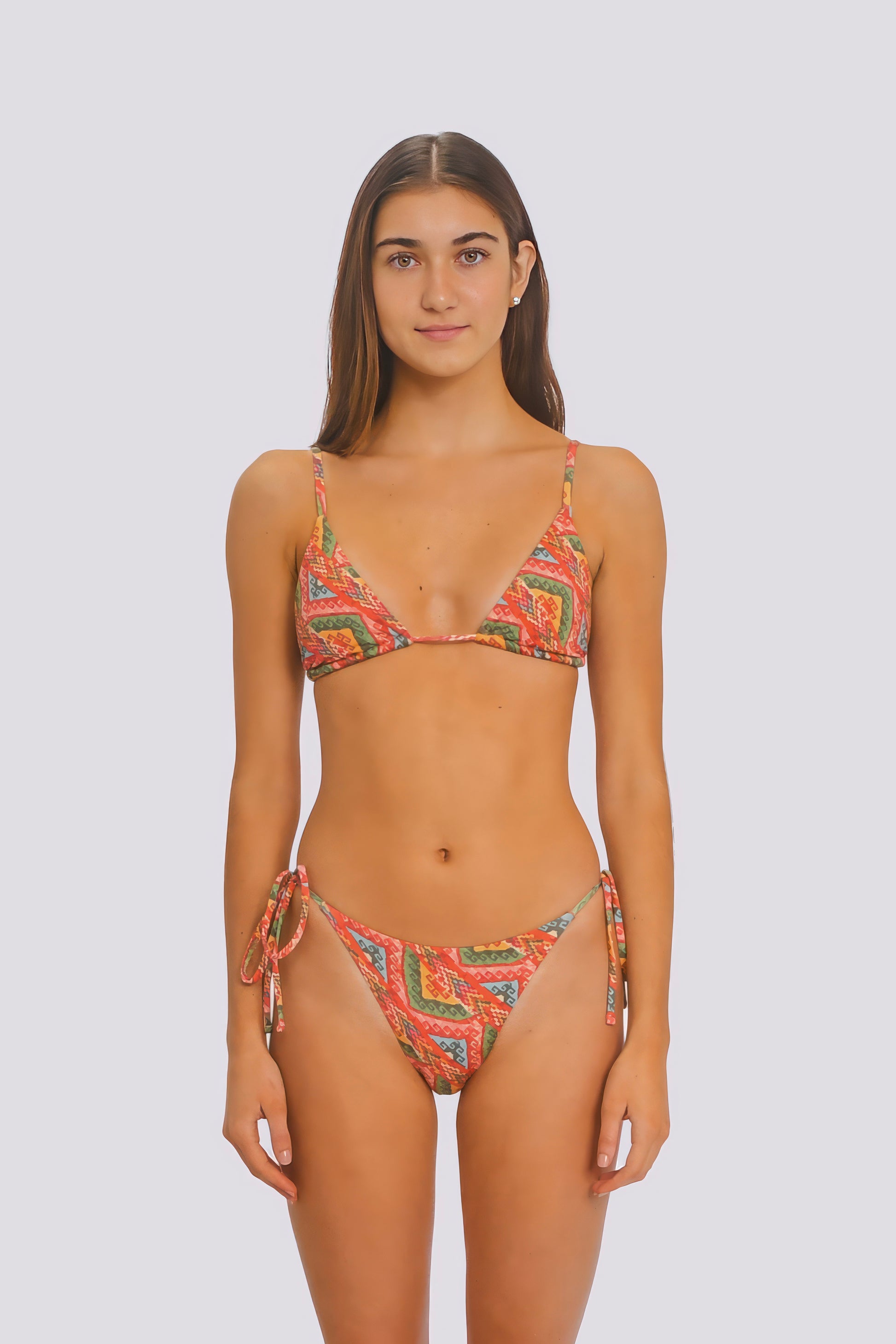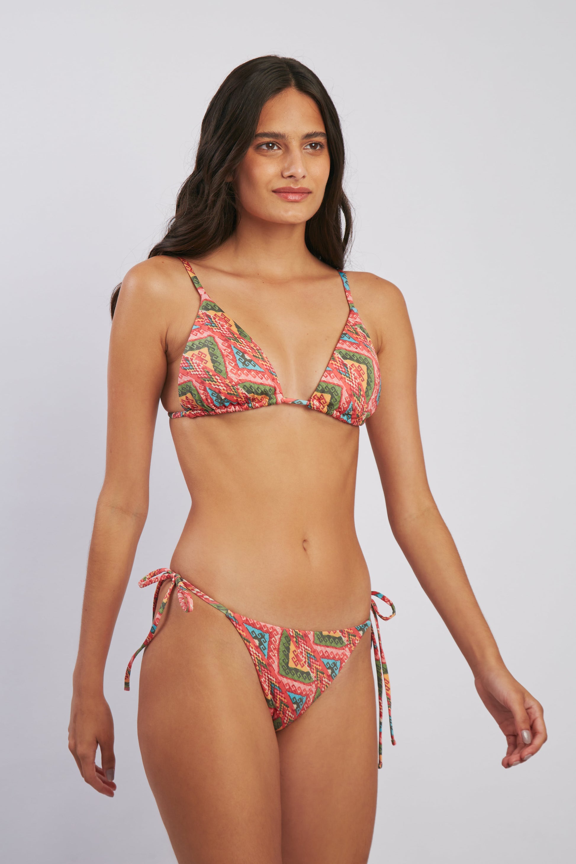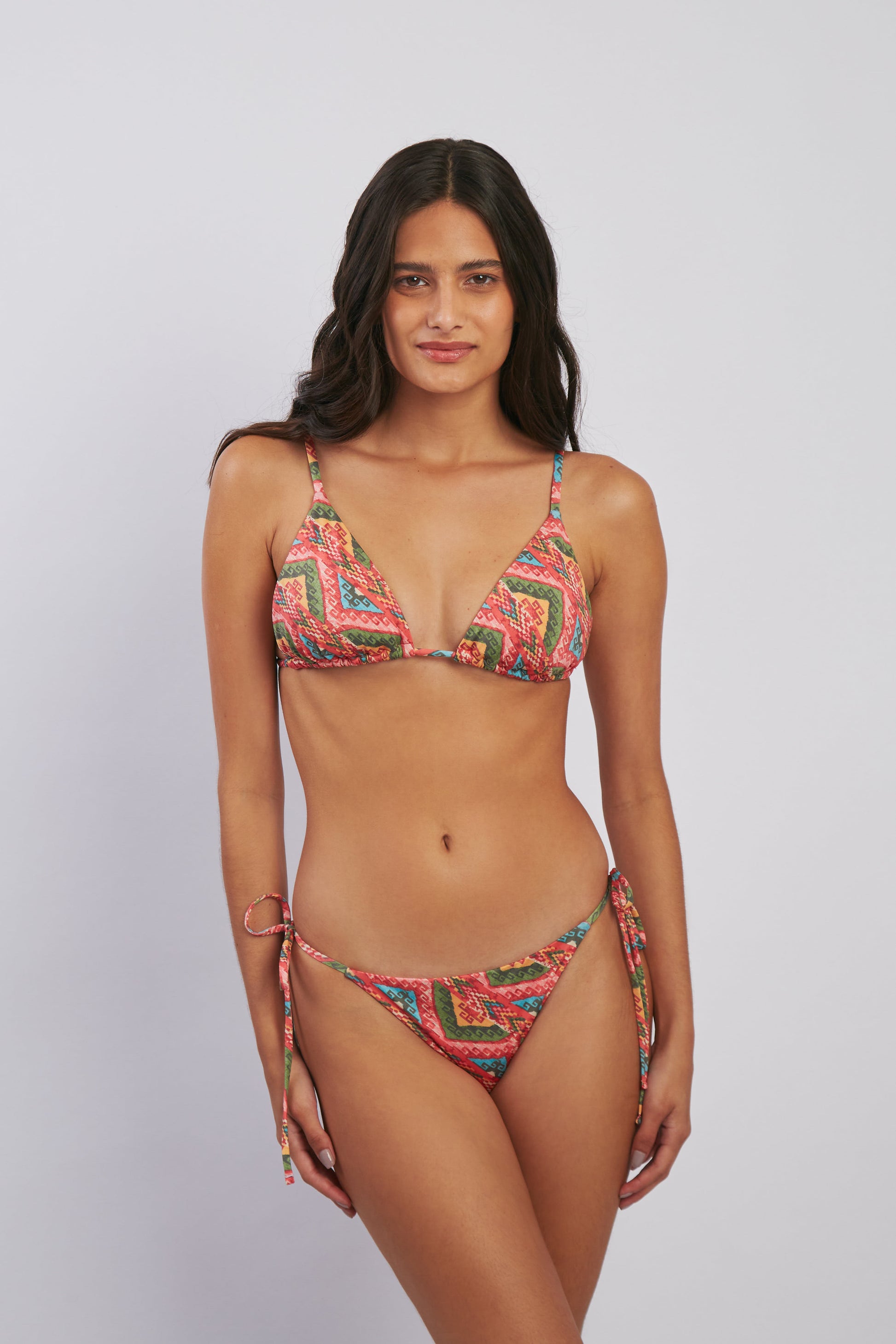 Nuestro estampado Andi busca rendir homenaje a los colores y textiles pre-colombinos del Perú. Hecho de fibras recicladas y luciendo una variedad de colores, este bikini es el complemento perfecto a tu bronceado. Diseñado y hecho con amor por mujeres para mujeres.