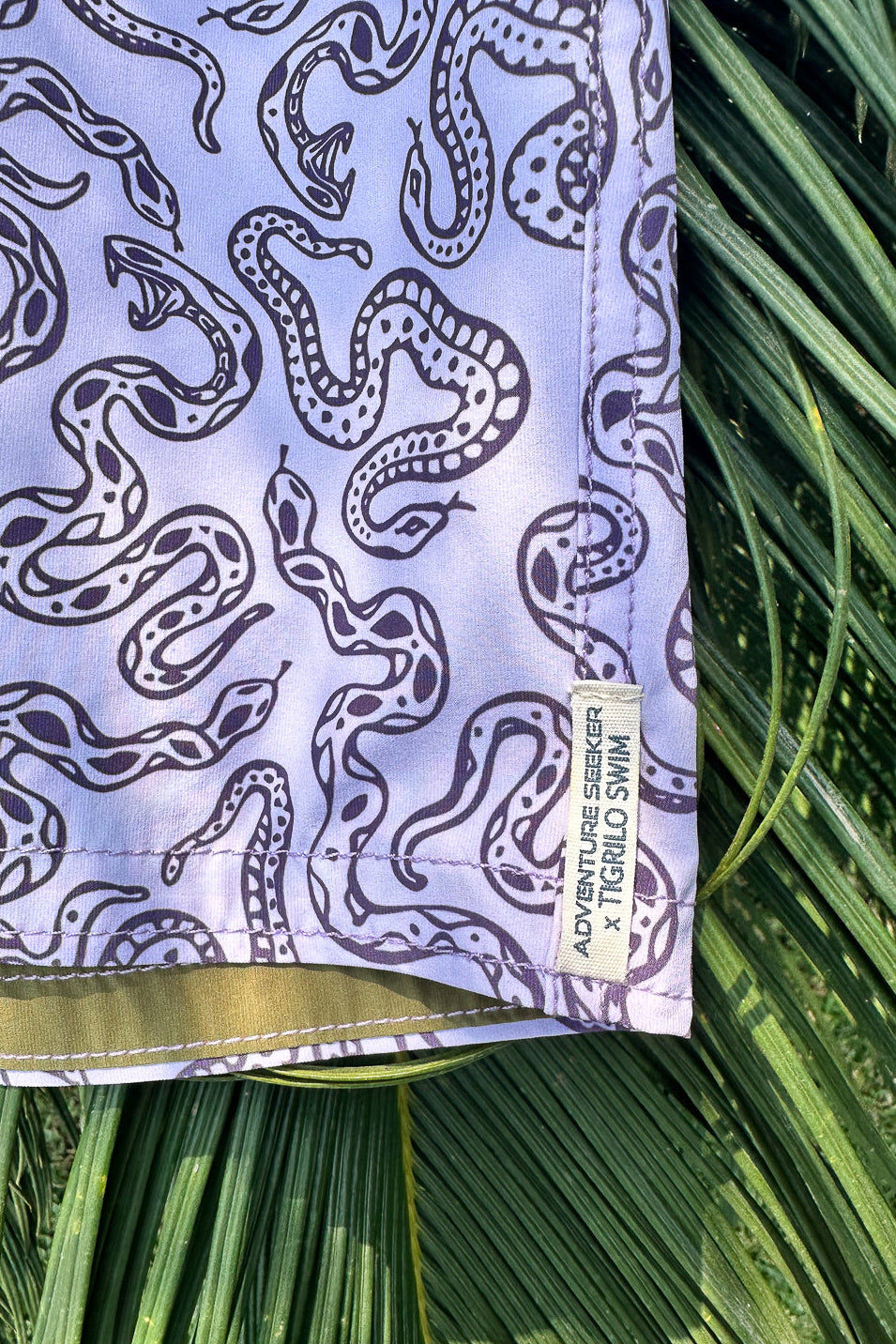 Our military green swim short nods to classic Amazon explorer gear, built for moving light and staying sharp. On the reverse, soft lilac and winding purple snakes follow the rhythm of life beneath the canopy. Wild, layered, and always in motion, made for the jungle-born curiosity of those who wander thoughtfully.